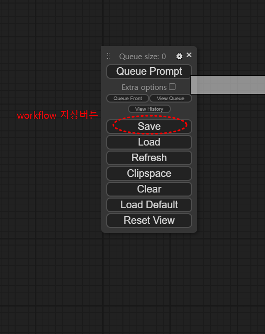 ComfyUI 워크플로우 파일 자체를 저장하려면 Queue 메뉴의 Save를 클릭하면 된다